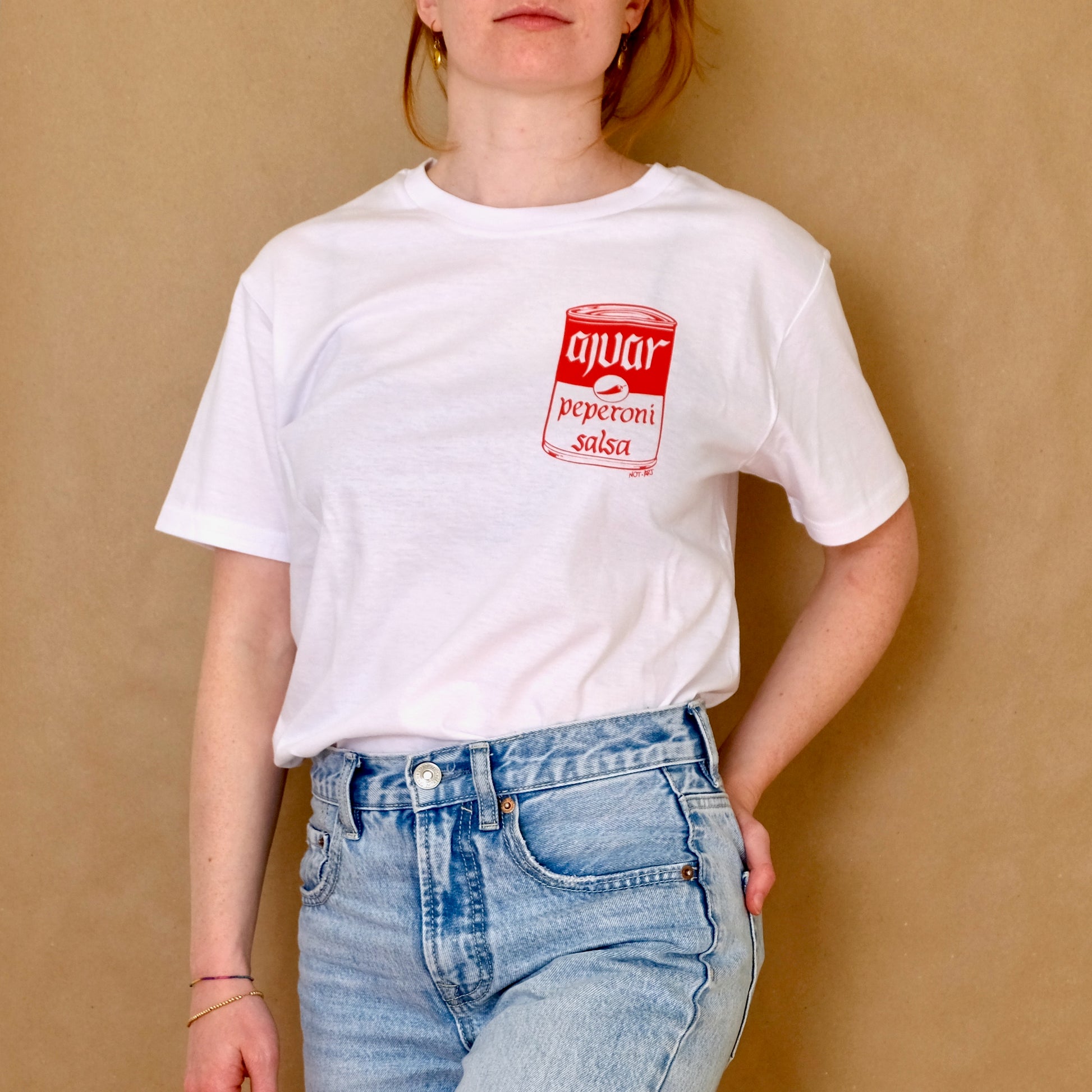 Nella foto la modella è alta 1.60 e indossa una XS il modello è alto 1.80 e indossa una M. Le maglie sono 100% cotone organico.