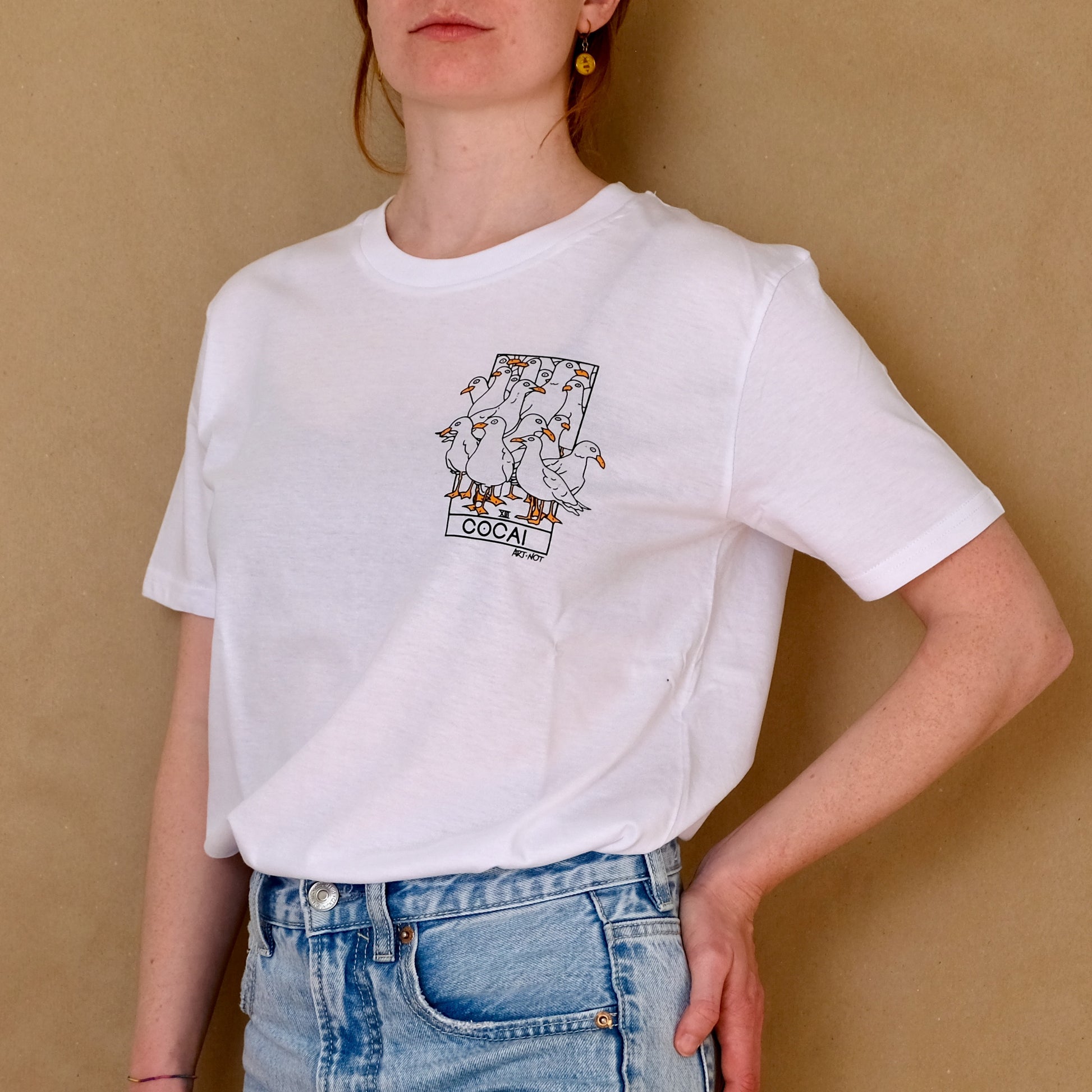 Nella foto la modella è alta 1.60 e indossa una XS il modello è alto 1.80 e indossa una M. Le maglie sono 100% cotone organico.