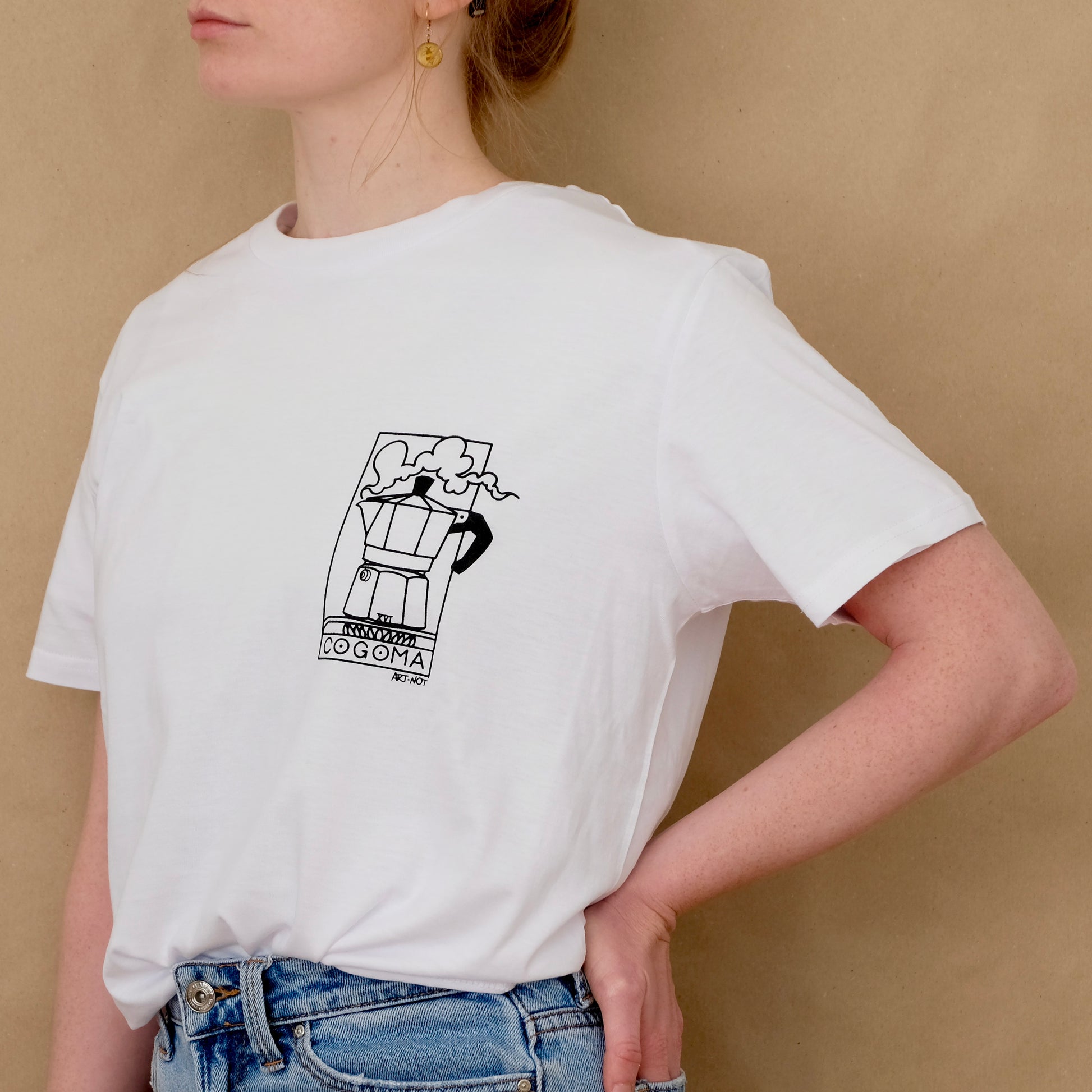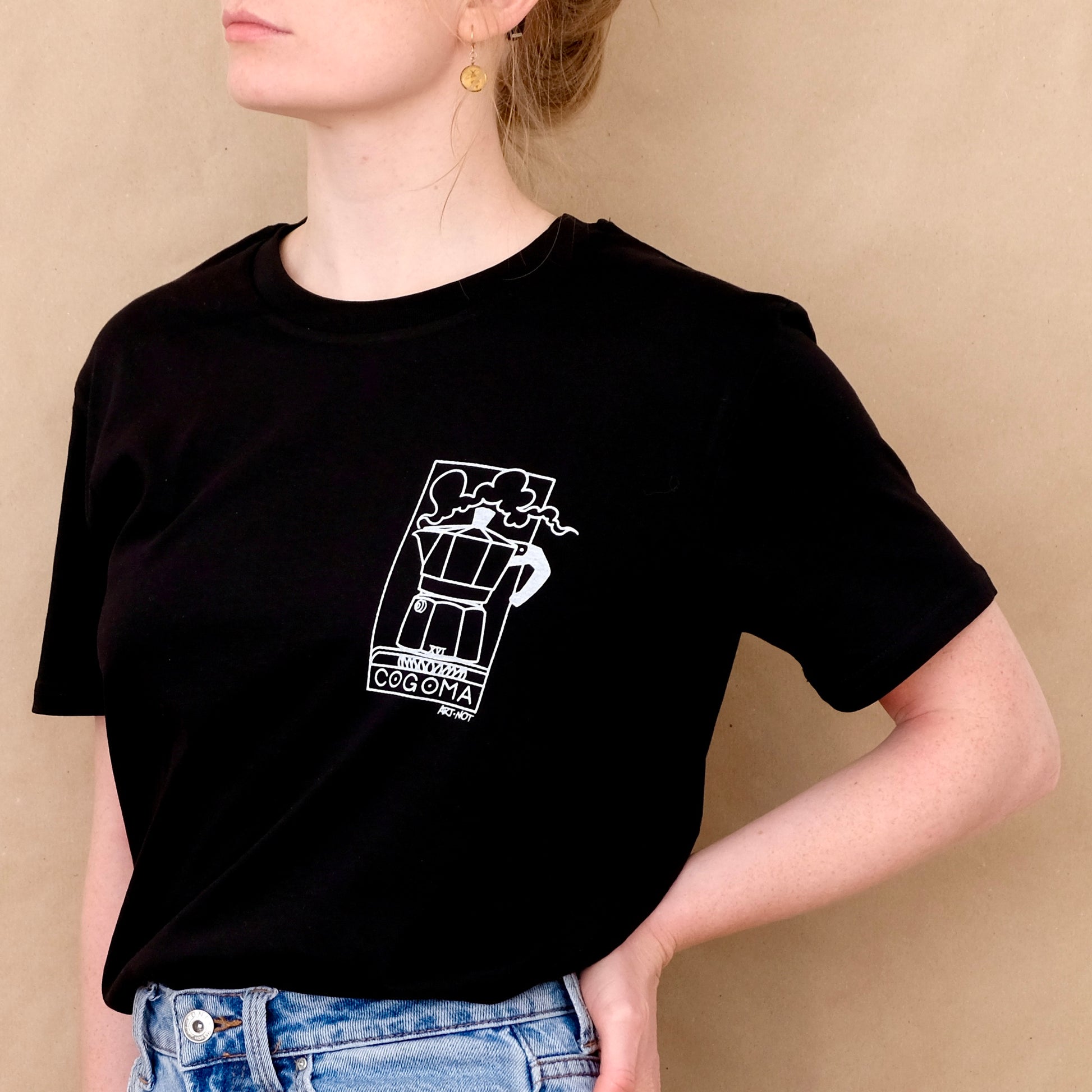 Nella foto la modella è alta 1.60 e indossa una XS. Le maglie sono 100% cotone organico.