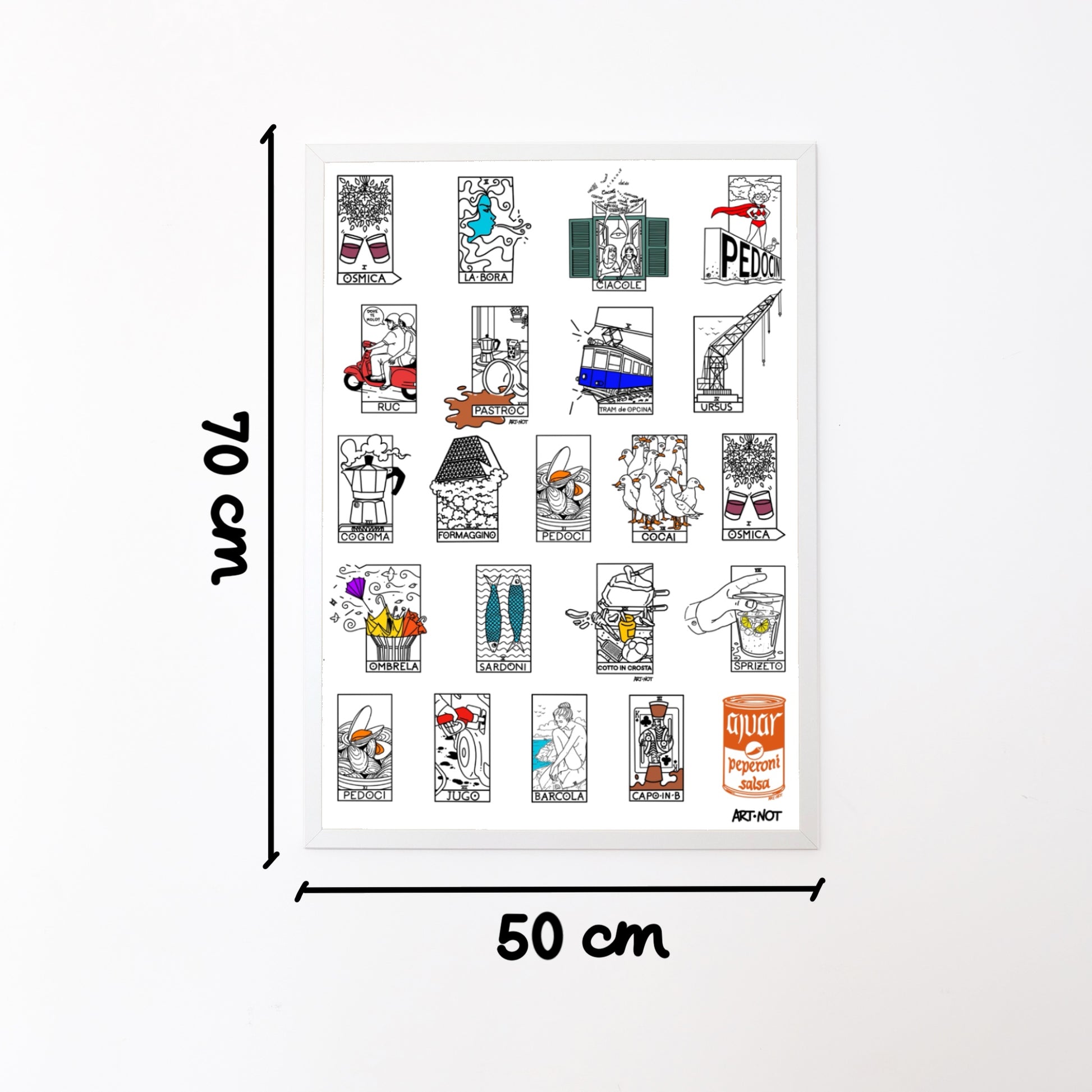 I poster sono disponibili nel formato 70cm x 50cm su carta da 150 grammi. Per il momento non vendiamo la cornice.