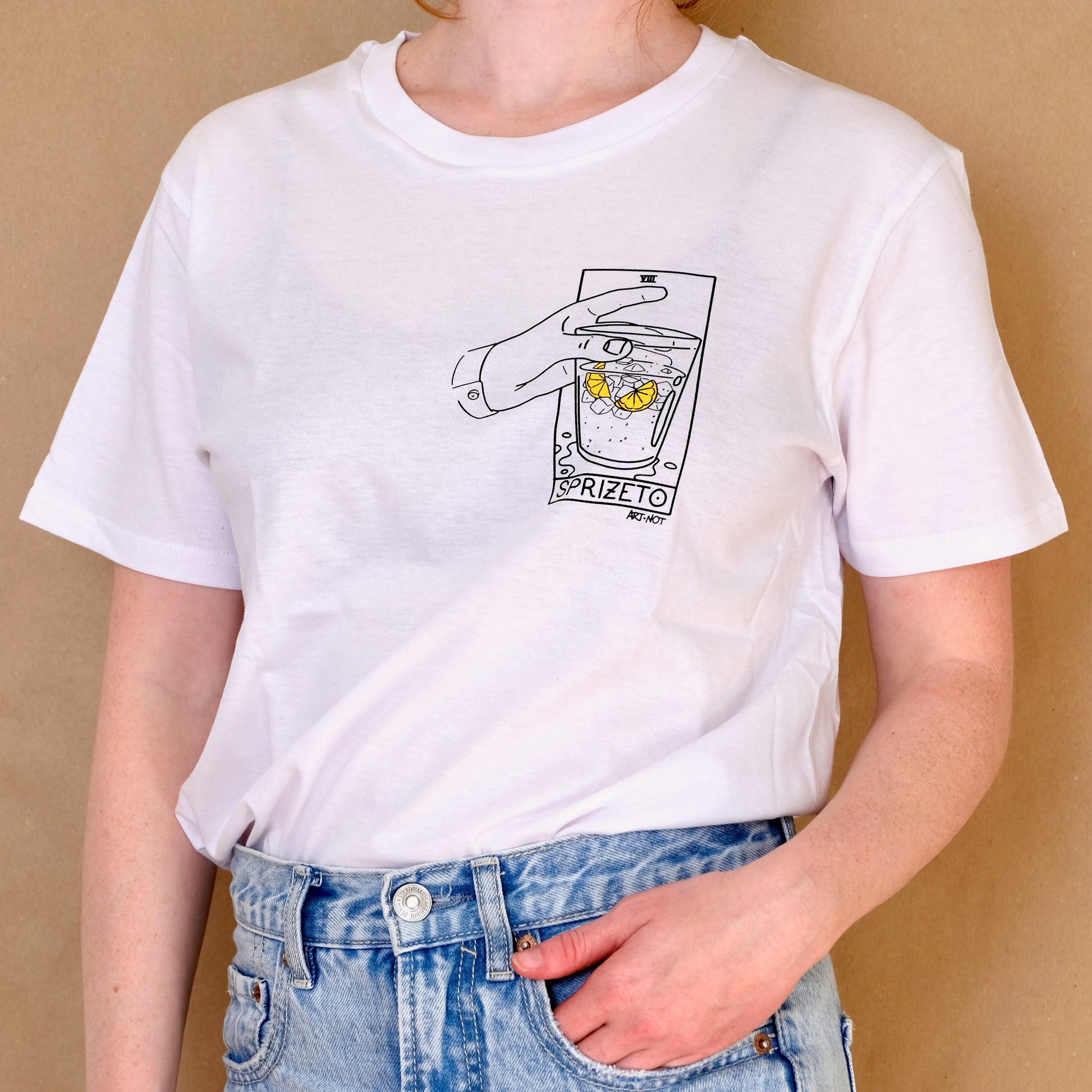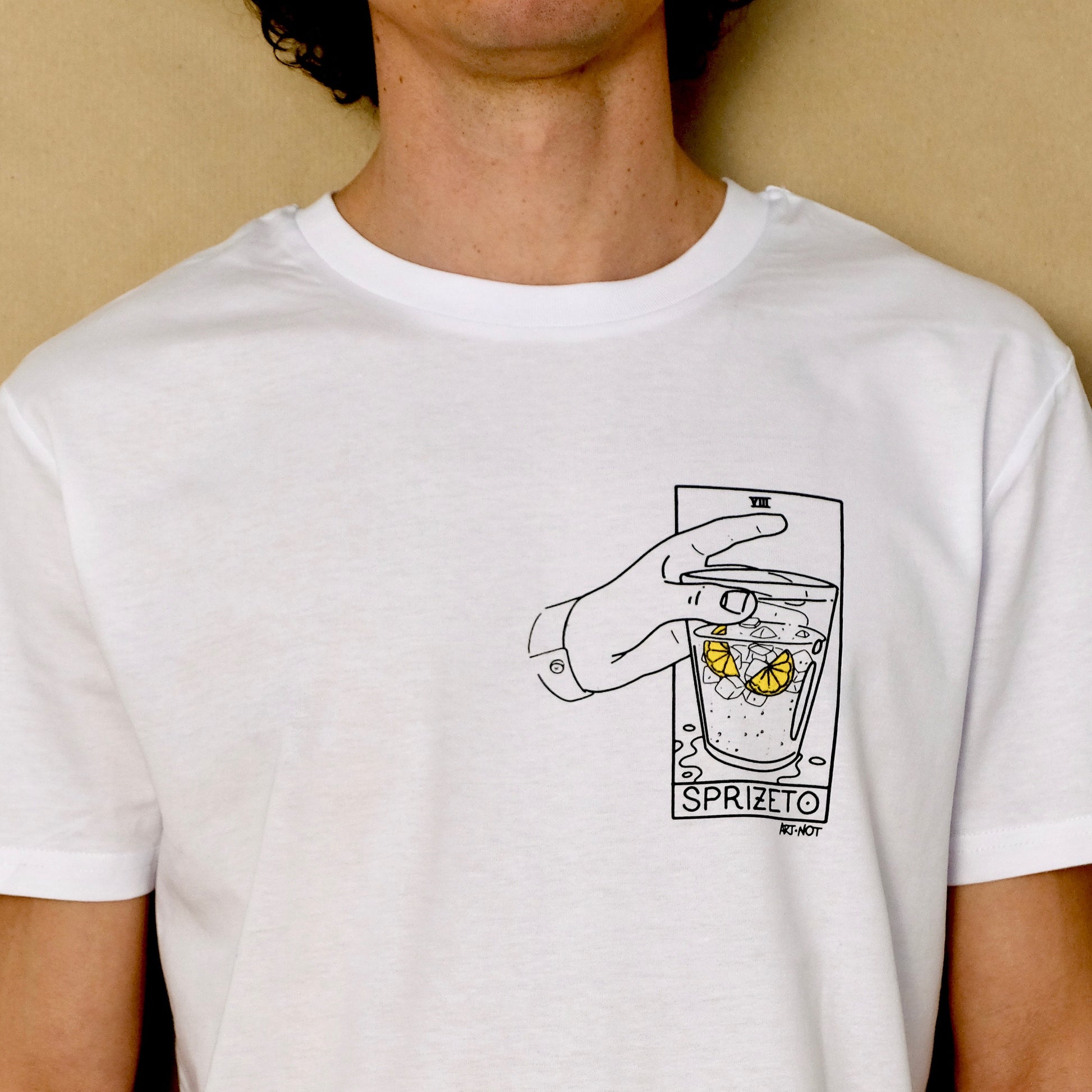 Nella foto la modella è alta 1.60 e indossa una XS il modello è alto 1.80 e indossa una M. Le maglie sono 100% cotone organico.